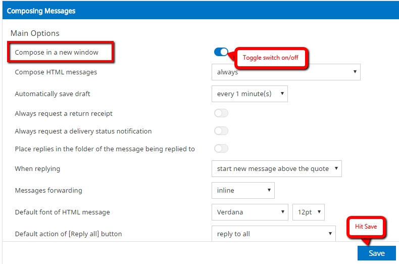 With this option checked, the message compose form will open in a new window instead of the current browser window/tab.
